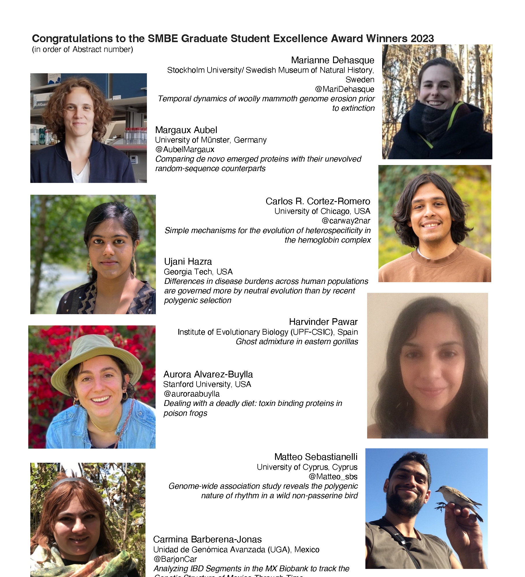 Congratulations to the SMBE Graduate Student Excellence Award Winners 2023 Back to Featured News Congratulations to the SMBE Graduate Student Excellence Award Winners 2023 By Society for Molecular Biology and Evolution 5/24/2023 Images × Share × Email Facebook LinkedIn X Pinterest Powered By GrowthZone